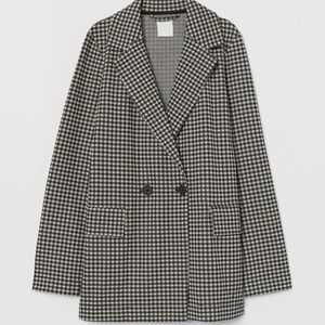 Gently fitted, double-breasted jacket in thick, patterned jersey. Narrow notched lapels and front pockets with flap. Unlined.