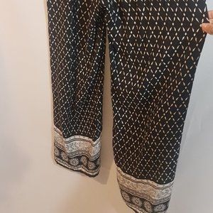 fun comfy wider leg pant black/white pattern with more white pattern along bottom, elastic waist, side pockets