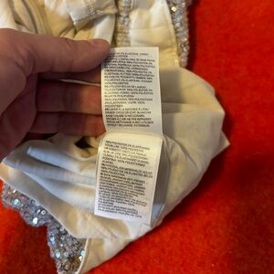 H&M cream flounce-trimmed sequined long sleeve mini dress new with tags. Short dress in sequined mesh with billowing flounces at front extending over shoulders to back. Concealed 21’’ long zipper at back, long sleeves with close-fitting forearms, and seam at waist with gently-shaped A-line skirt. Lined in jersey made from recycled polyester. Very feminine, romantic and expensive looking. Marked size M. All measurements are approximate and taken with the garment laying flat: Armpit to armpit 18" Total length 34". This item comes from a smoke free, pets friendly home. Recycled bags/box used when possible. Please, let me know if you'd like any additional info. Thanks for watching!