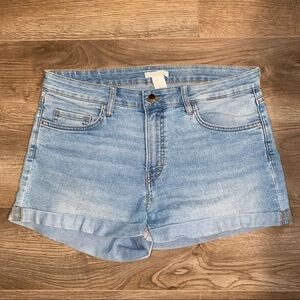 5-pocket shorts in washed stretch denim with a high rise waist, zip fly, and sewn cuffs at hems.
