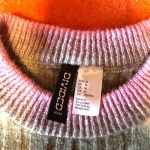 H&M khaki and pink gradient stripes touch of wool ribbed sweater new without tags. Ribbed knit sweater in soft gradient stripes of pink, khaki green, and cream, creating a dreamy ombre effect. Made from a cozy blend of 65% acrylic, 27% polyester, 6% wool, and 2% elastane, it feels plush and warm yet lightweight enough for layering. The ribbed texture gives it gentle stretch and shape, with dropped shoulders and a relaxed, slightly cropped fit. A modern take on classic pastel knits, soft, cozy, and easy to style with denim or wide-leg trousers. Marked size M Medium but fits oversized, please see measurements. All measurements are approximate and taken with the garment laying flat : Armpit to armpit 23", total length 20.5". This item comes from a smoke free, pets friendly home. Recycled bags/box used when possible. Please, let me know if you'd like any additional info. Thanks for watching!