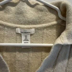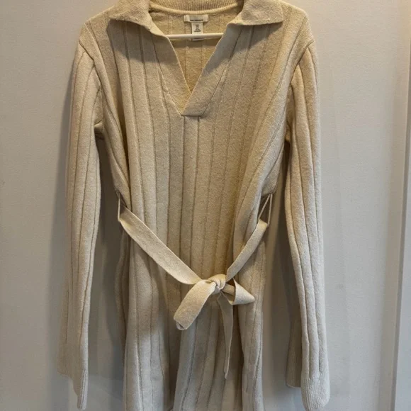 Stay stylish and comfortable with this cream sweater. Perfect for any occasion, it features a unique belt design for added flair.