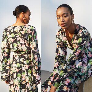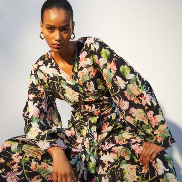 H&M pleated wrap dress floral tropical black green kimono coverup maxi medium