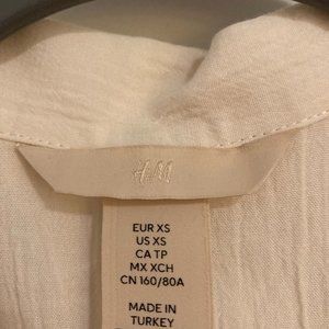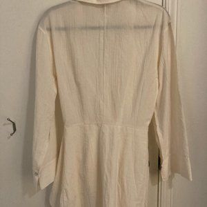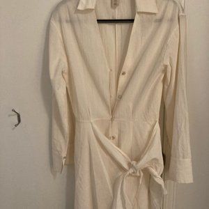 Short dress in woven fabric. Collar, V-neck, and discreet pearlescent buttons at front. Gently dropped shoulders, long, straight-cut sleeves, and wide cuffs with slit and button. Seam at waist and wrapover skirt with ties at one side. Unlined.