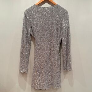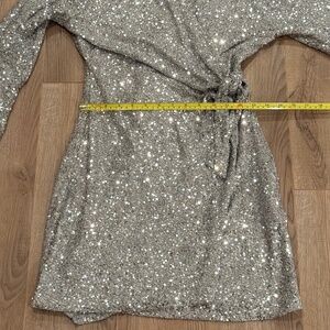 H&M silver sequins wrap dress with waist ties, size M. Great condition, tags still attached though worn once. Super sparkly and eye catching. Runs a little large for true size M as it's stretchy. Please note interior waist button band has been diy replaced, and functions as normal.