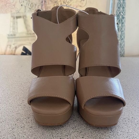 Wide strap beige platform sandals with chunky heels and gold side buckle. These sandals are brand new, never worn without tag.