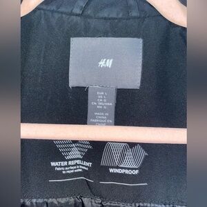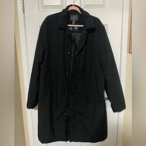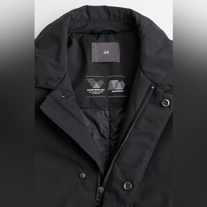 Padded car coat in windproof, water-repellent fabric. Zipper at front with wind flap and snap fasteners. Diagonal welt side pockets, an inner pocket, and a vent at back. Lined.
