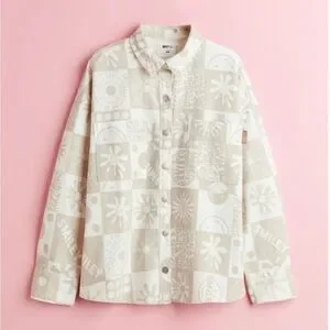 Add a fun, expressive vibe to your wardrobe with this limited-edition H&M / Smiley® collaboration oversized button-up shirt jacket. Designed in a neutral beige/cream palette, this piece features an allover Smiley graphic patchwork print with retro-inspired doodles, symbols, and cheerful icons. Soft, lightweight, and ultra-comfortable — perfect for layering year-round.