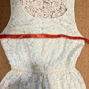 This adorable lace dress by H&M Divided features a delicate white floral lace design with a subtle mint undertone lining. Its ruched elastic waist and A-line flare create a flattering silhouette, making it perfect for a variety of occasions.