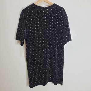 Comfy loose fit black velour short sleeved dress with gunmetal / pewter toned sparkling jewel dots all over. Excellent condition like new. No stains or tears, all bedazzled in place. US size M. zipper closure at back.