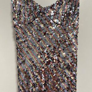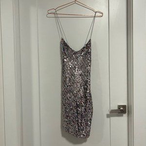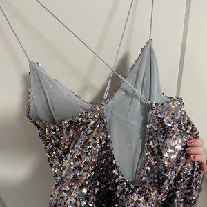 For Love & Lemons Showtime sequinned dress featuring asymmetrical hem, slide slit, and open back.