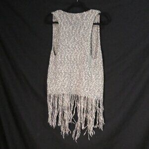 Cozy sleeveless knit sweater vest with an open front and long fringe detailing along the hem