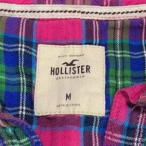 GUC Hollister ladies long sleeve snap closure plaid shirt. Colours are pink, purple, blue and green. Has been washed prior to listing but could use a good ironing.