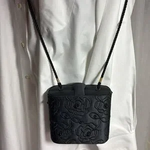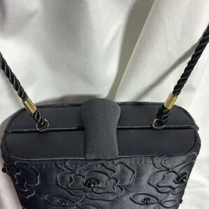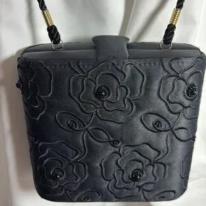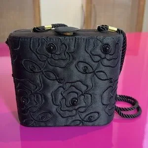 Unique Satin evening bag. Boxy with an Asian inspired feel. Black cord strap that also can be tucked inside & bag used as a minimalist box clutch. Covered in black satin fabric with embroidery and beaded design. Measures approx 5” x 6”. Strap hangs approx 22”.