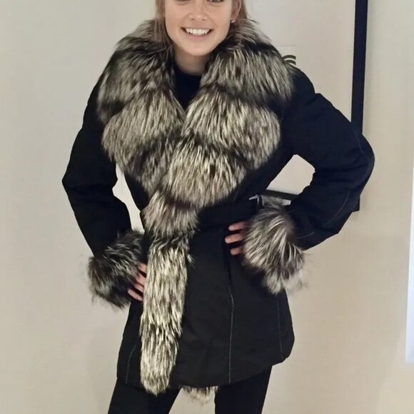 Stunning Luxury Holt Renfrew coat with a dramatic oversized fur shawl collar and fur cuffs.