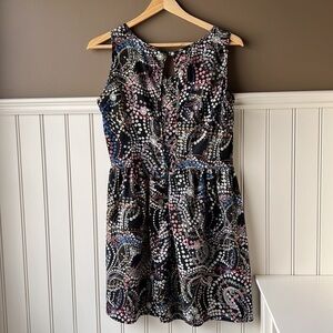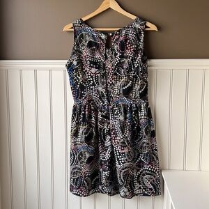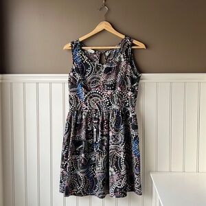 Pretty multicolored print with open back that has a gorgeous gold bow painted button to close at the neck. This lightweight dress will be perfect for summer.