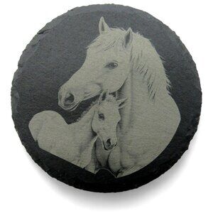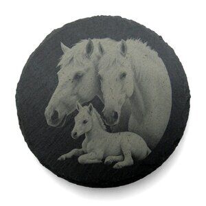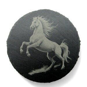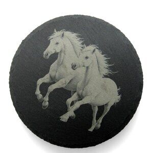These elegant gray slate coasters, adorned with beautifully etched horse designs, add a touch of sophistication to any setting.