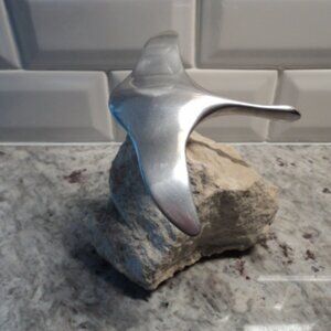 The HOSELTON Aluminum Bird Figurine on Rock is a small-sized sculpture featuring a goose in a mid-century modern style.