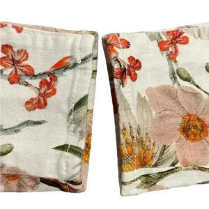 These pants offer a five pocket design with belt loops and feature a single button and zip closure. They are off-white with floral design. Good stretch to them.