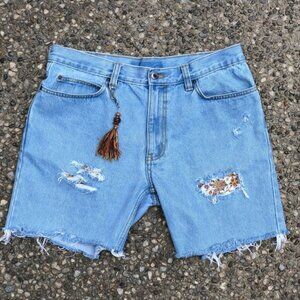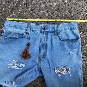 These upcycled Light Denim Jeans were given a new life with new purpose! Boholicious intentionally distressed cut off Jean shorts with Floral fabric patches and boho beaded tassel detail give these high waist light denim jeans some serious festival vibes! These Jean shorts are %100 cotton, they do not have spandex in them so they fit like the old school jeans used to fit back in the day! The tag reads size 36 but they fit more accurately to a 33/34. Please see measurements for fit before purchasing. *Price is for the shorts only, coordinating items sold separately in my closet.