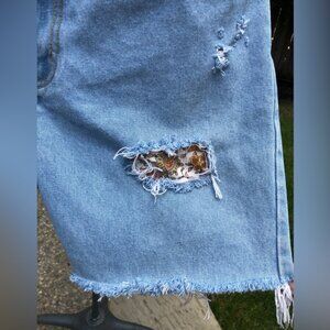Boho | Denim | Distressed Jean Shorts | Cut off Jean Shorts | Light Denim Wash | Ripped Jeans | Upcycled | Recycled | Repurposed | Patches | Torn | Ripped | Floral | Tassel | Festival | Festive | Summer | Beach | Cottage | Casual