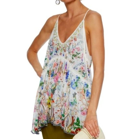 Camilla's crystal embellished, layered, printed, silk-georgette camisole in Ivory with whimsical print of flowers and butterflies has ruffled trim detail and is fully lined giving the appearance of a loose tank worn over a more fitted one, preventing any accidental peek-a-boos and also looking effortlessly layered and styled. Both layers have the same print though the above layer is lightweight silk giving a more sheer appearance.Gorgeous flowing top slips on.