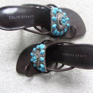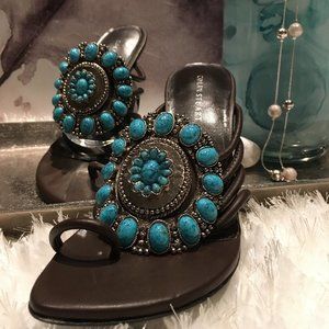 Gorgeous Summer sandals silver setting with turquoise stones on brown leather.