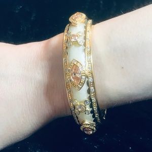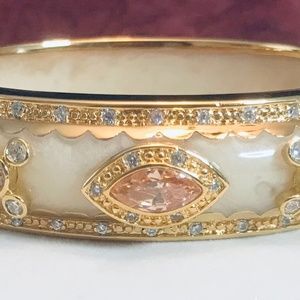 Vibrant, elegant, and bold…is how Cristina Sabatini is described by fashion icons. This hinged bangle lives up to that description. It has gold-plated trim and creamy white enamel decorated with a multitude of vibrant crystals.