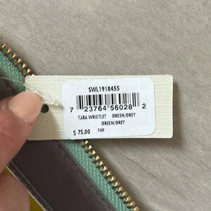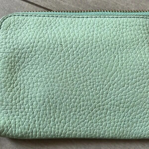 100% Leather wristlet wallet in mint green with gold hardware and FOSSIL LOGO. Grey tassel zipper closure with inside card slots.