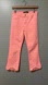 Slim fit, cropped Asymmetric frayed hems with lace underlays, ankle slits. Zipper fly. Five pockets. Faded fluorescent peach color. Stock photo shows fit.