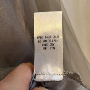 This dress was never worn. New Condition. Such a pretty dress and so unique with stretch knit long sleeve top attached to a full tulle skirt. Side zipper. The skirt has 2 sheer layers and 1 satin layer in a beautiful grey tone.