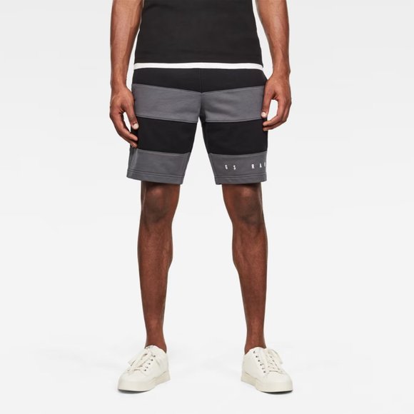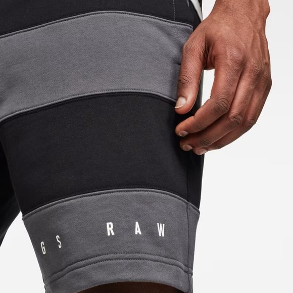 These Premium Block Stripe shorts feature a horizontal stripe repeat. An elasticated waist and drawstring create a comfortable wear. This style offers seam pockets with a hidden snap closure at the front and a horizontal welt pocket at the back. A GS RAW graphic at the lower leg completes it.
