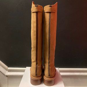 Purchased in Paris and worn only once, nearly-new ROBERT CLERGERIE Camel-Colored Suede Knee-High Boots. Measure 17.5 inches high at highest point at side of boot shaft. Zipper closure at back. Come with original dust bags, no box. Size 38.5. Made in France.