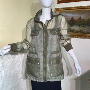 This unique jacket features a sheer green fabric, long sleeves, zip front, flat snap pockets, faux chest pockets, adjustable drawstring waist, hood (can be zippered into neck pocket).