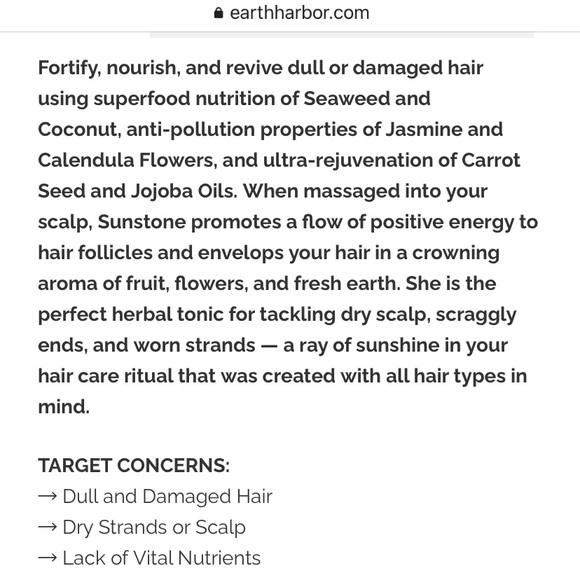 Fortify, nourish, and revive dull or damaged hair using superfood nutrition of Seaweed and Coconut, anti-pollution properties of Jasmine and Calendula Flowers, and ultra-rejuvenation of Carrot Seed and Jojoba Oils. When massaged into your scalp, Sunstone promotes a flow of positive energy to hair follicles and envelops your hair in a crowning aroma of fruit, flowers, and fresh earth. the perfect herbal tonic for tackling dry scalp, and worn strands