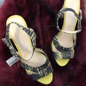 Zara ankle strap platform sandals in a warm yellow lime and brown, in exotic leaf design, great quality textile, open toe, made in Spain.