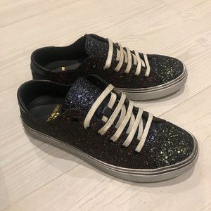 Beautiful glittery sneaker with distressed sole details. Has a hint of red, blue and green. Leather lining. Size is 6.5 but it can also fit a size 7 foot. I am usually a 7 and these fit me. Originally purchased at Saks Fifth Avenue for $696.50 + tax = $787