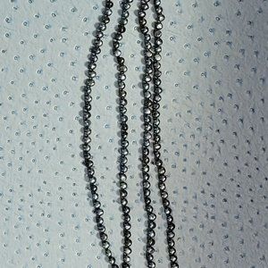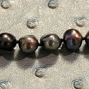These pearls are beautiful! They are black with an iridescent sheen like an oil slick. The pearls are size matched and knotted so pearls aren't lost if the necklace breaks. Can be worn long, knotted or wrapped more than once for a layered look.