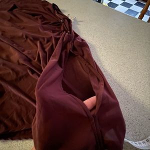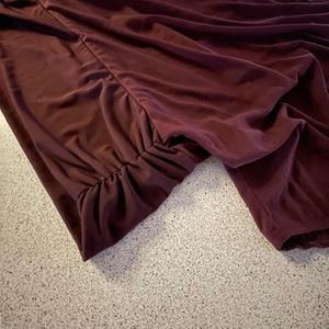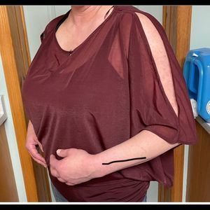 This sheer burgundy top by Jennifer Lopez has open top 3/4 sleeves, an elastic waist, built in camisole and a cute little jewelled button.