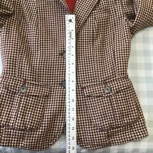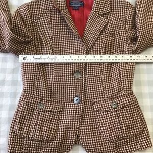 Item keywords: Vintage American Eagle, Y2K Preppy Blazer, Tailored Wool Jacket, Brown Ecru Houndstooth, Red Lining, Structured Fit, Classic Heritage Style, Modern Denim Style, Smart & Casual, New Preppy, Normcore, Elevated Basics, Retro Heritage-Inspired, Capsule Wardrobe, Everyday Luxury, Office Siren, Chic & Classy, Statement Layer, Polished Wool Blazer, Fall Fashion Essential
