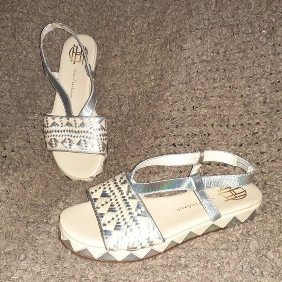 HOUSE OF HARLOW 1960-Woven Pattern Leather Wedge-Beige/Silver-Sz 36-NWT