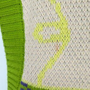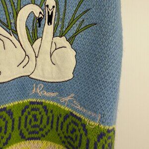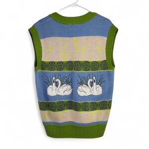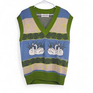 Playful House of Sunny swan-motif knit vest in green/blue with cream intarsia, ribbed V-neck and hem. Tag size US 6 / UK 10 / EU 38 (fits like a Womenโs Mโsee measurements).