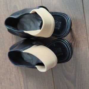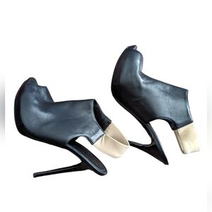 Peep-toe Booties from Alexander McQueen designed with a black leather upper and cream elastic band sling back featuring a stiletto heel.