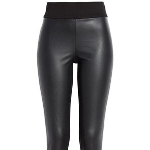 Comfortable high-waist leggings feature a sleek faux-leather front for elevated appeal.