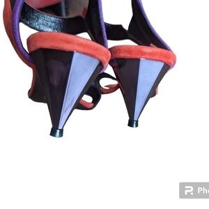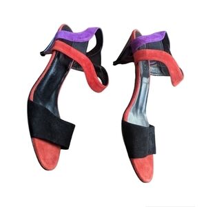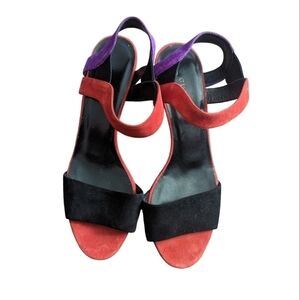 Colour blocked (red, black and purple) suede leather.