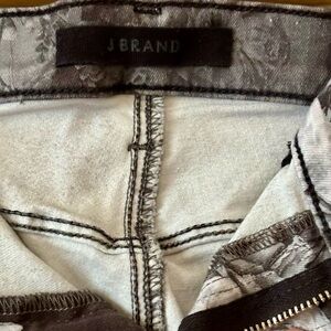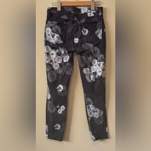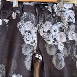 These J Brand skinny jeans showcase a captivating floral print in gray and white, set against a dark gray denim backdrop. Size 28, In good pre-owned condition, laundered and ready to wear.