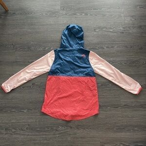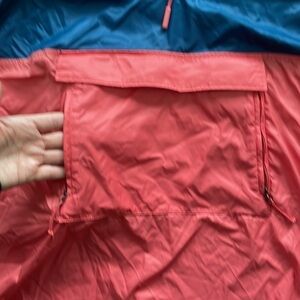 EC fanorak by The North Face in a wonderful spiced coral/ blue and light pink combination. Made of nylon and polyester it forms a wind wall and is easy care. Zippered and Velcro storage pouch with 2 zippered areas accessing a bunnyhug pocket. Can be folded to stow away in pouch when not in use. It is missing the band to turn this into a wearable pouch but doesn’t affect the wear. Approximate measurements laying flat pit to pit 18”, length 26”, arm length from shoulder seam 24”. This is in amazing condition and awaiting a new home from spring. The first 4 images are for inspiration only and not for sale. The listed item is featured in the remaining images.