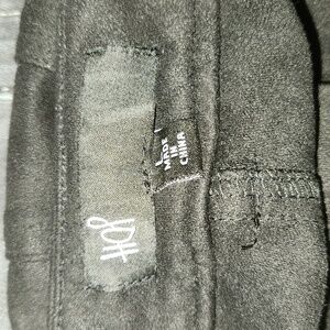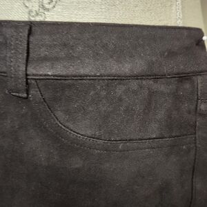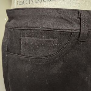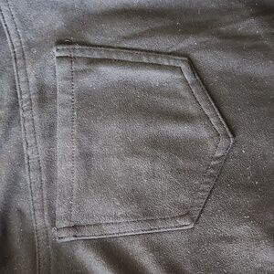 Soft stretchy black microfiber moto style jeggings with reinforced ribbing thigh detail and back patch pockets, by HQP.