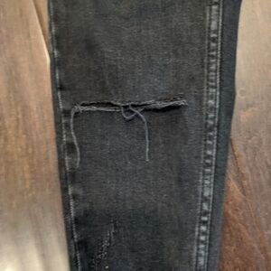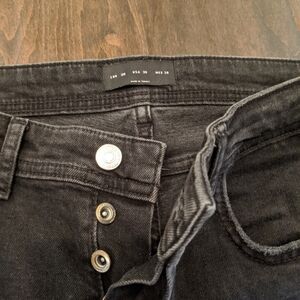 Cute pair of high rise distressed jeans with multiple button closure and frayed hem! They also have a slit hole on one leg as well.