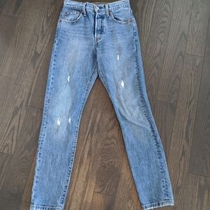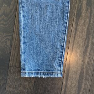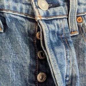 Cute pair of light wash Levi jeans with a tapered leg, high rise, multiple buttons and distressed marks on thighs and hem.